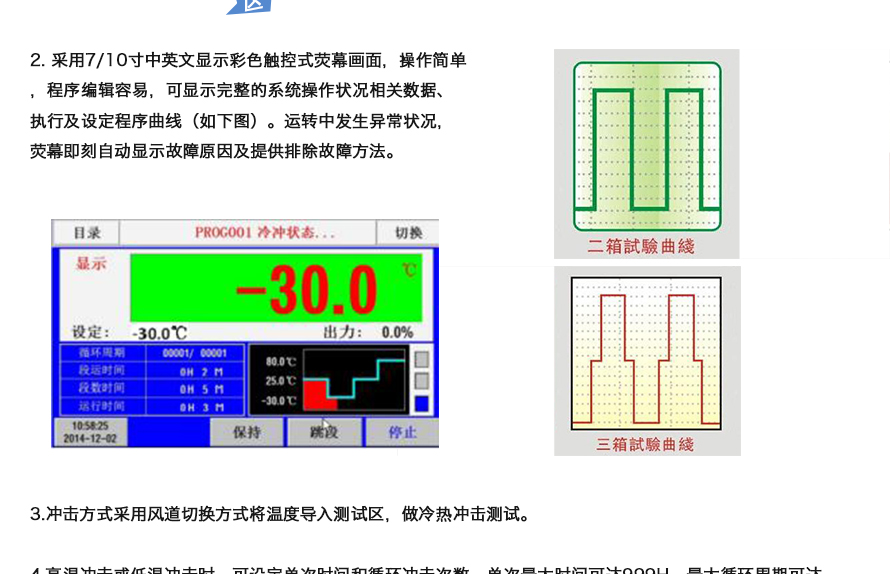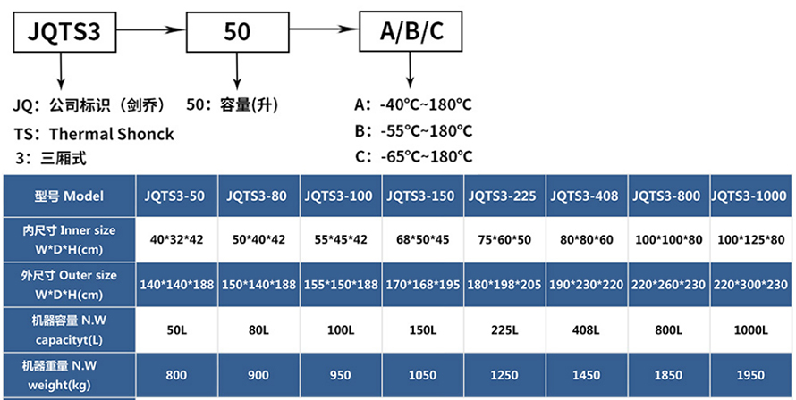 產(chǎn)品型號(hào):JQTS3-408 品牌:劍 喬 用途:用途:三箱式冷熱沖擊試驗(yàn)箱又名溫度沖擊試驗(yàn)或高低溫沖擊試驗(yàn)是用于考核產(chǎn)品對(duì)周圍環(huán)境溫度急劇變化的適應(yīng)性,裝備設(shè)計(jì)定型的鑒定試驗(yàn)和批產(chǎn)階段的例行試驗(yàn)中不可缺少的試驗(yàn)
