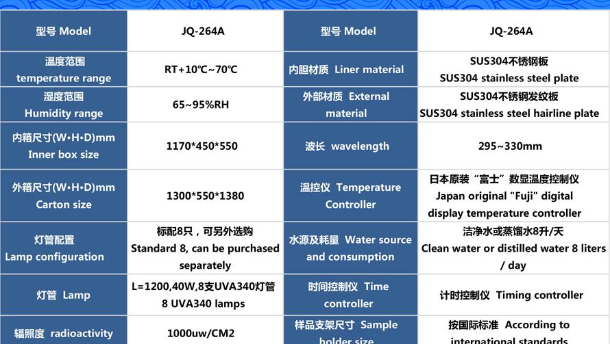 產品型號:JQ-264A 品牌:劍 喬 用途:紫外耐氣候試驗箱主要用于塑料,涂料、橡膠材料在模擬由太陽光,雨水、露水環境下的人工加速試驗